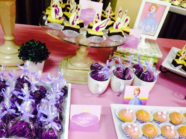 Sofia the first themed dessert buffet for Steffi's 1st birthday! ☺️ Our menu: Cookie butter stuffies, brownie cheesecake, chocolate cupcakes and vanilla cream puff.